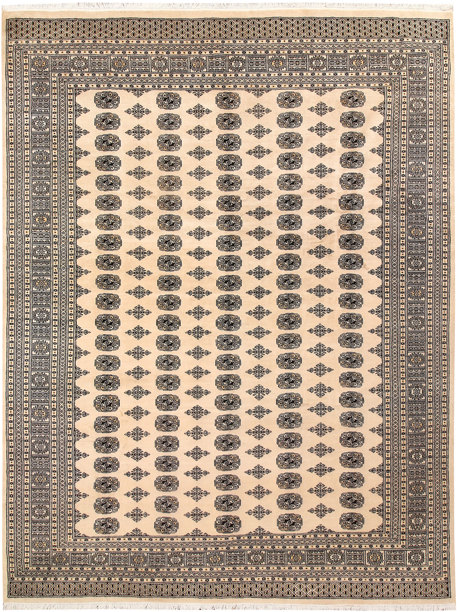 Filled with symbolic patterns and ancient designs, handmade Bisque Bokhara 9' x 12' Rectangle rugs can direct attention towards themselves like nothing else!