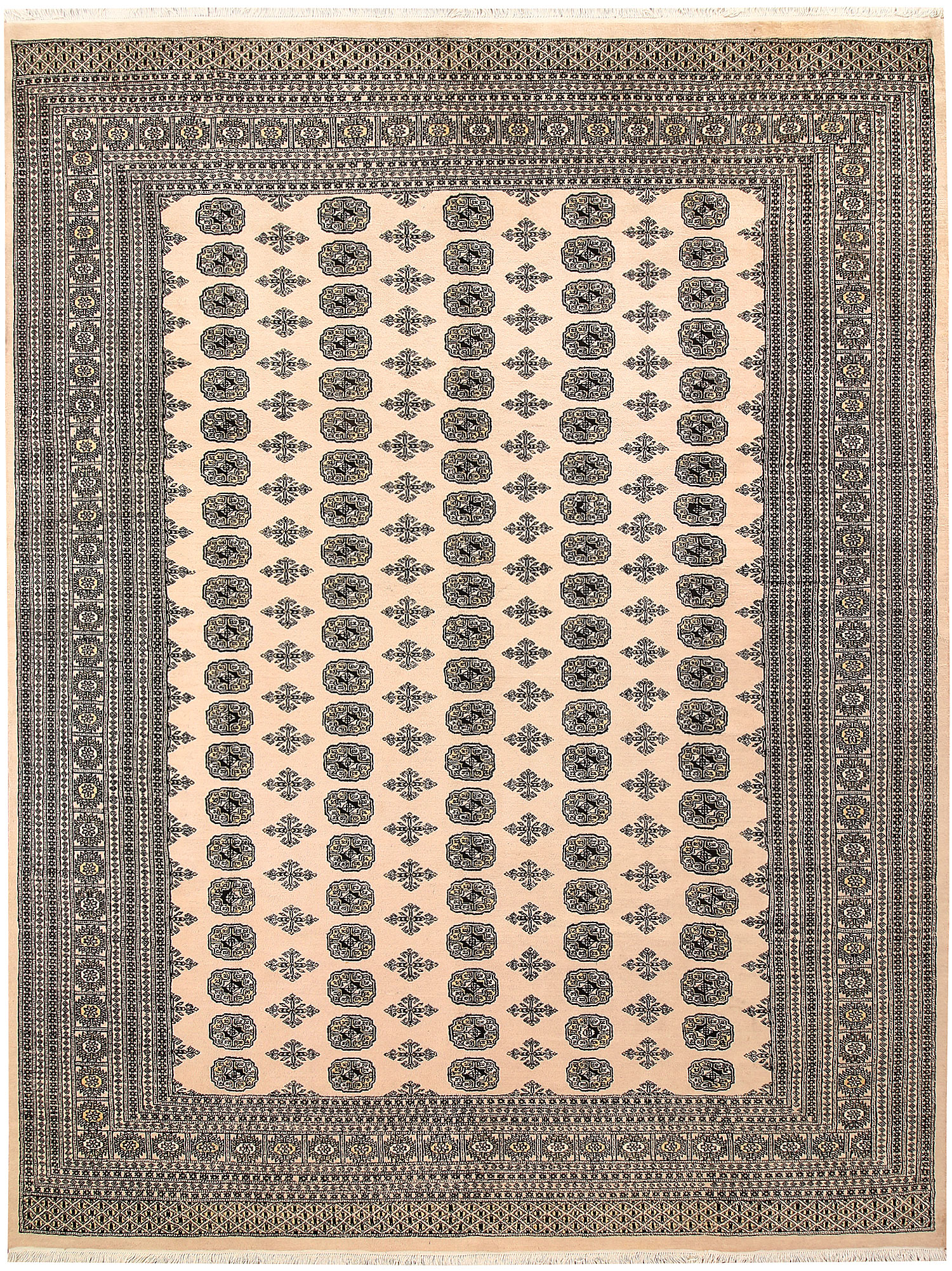 Filled with symbolic patterns and ancient designs, handmade Bisque Bokhara 9' x 12' Rectangle rugs can direct attention towards themselves like nothing else!
