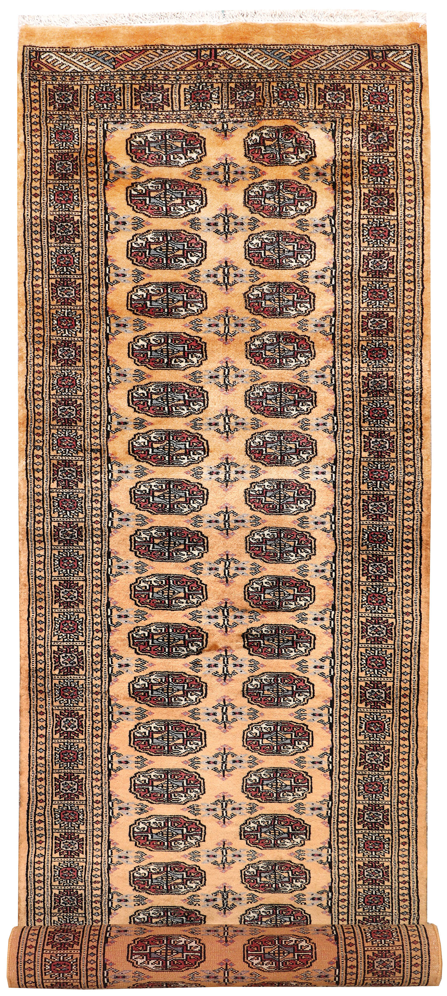 Yomud Bokharas are named after the Yomud tribe residing in Central Asia. They are known for their Caucasian features and Persian or Turkish knots. Many have diagonal rows in which a single diamond-or lozenge-shaped motif is repeated with various colors. The larger Yomut carpets are made entirely of wool or goat hair, generally in symmetrical knotting; in small pieces, for which asymmetrical knotting is used more frequently. 2' 6" x 9' 6" area rugs are the most popular among home owners.
