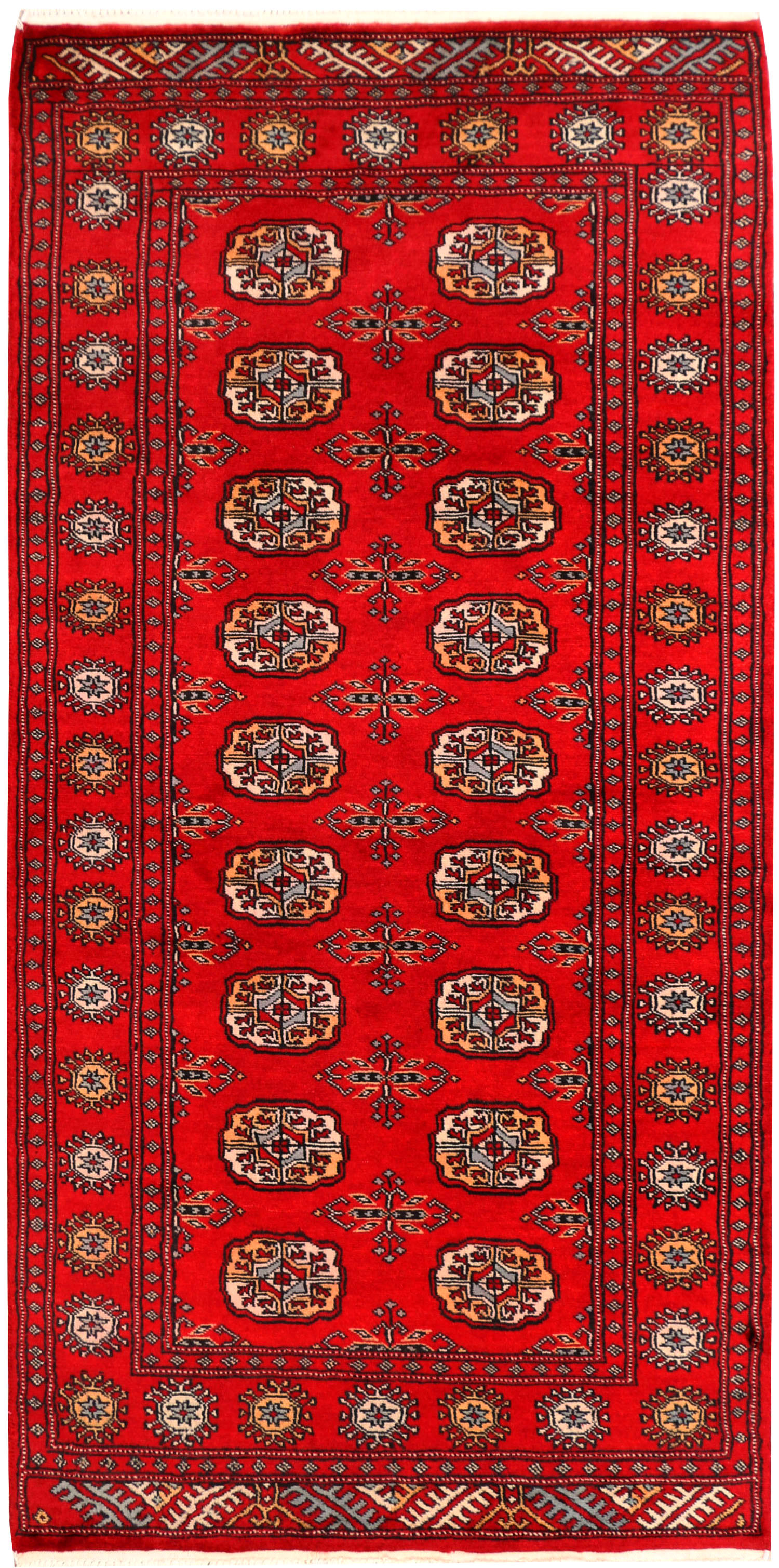 Yomud Bokharas are named after the Yomud tribe residing in Central Asia. They are known for their Caucasian features and Persian or Turkish knots. Many have diagonal rows in which a single diamond-or lozenge-shaped motif is repeated with various colors. The larger Yomut carpets are made entirely of wool or goat hair, generally in symmetrical knotting; in small pieces, for which asymmetrical knotting is used more frequently. 3' x 6' area rugs are the most popular among home owners.
