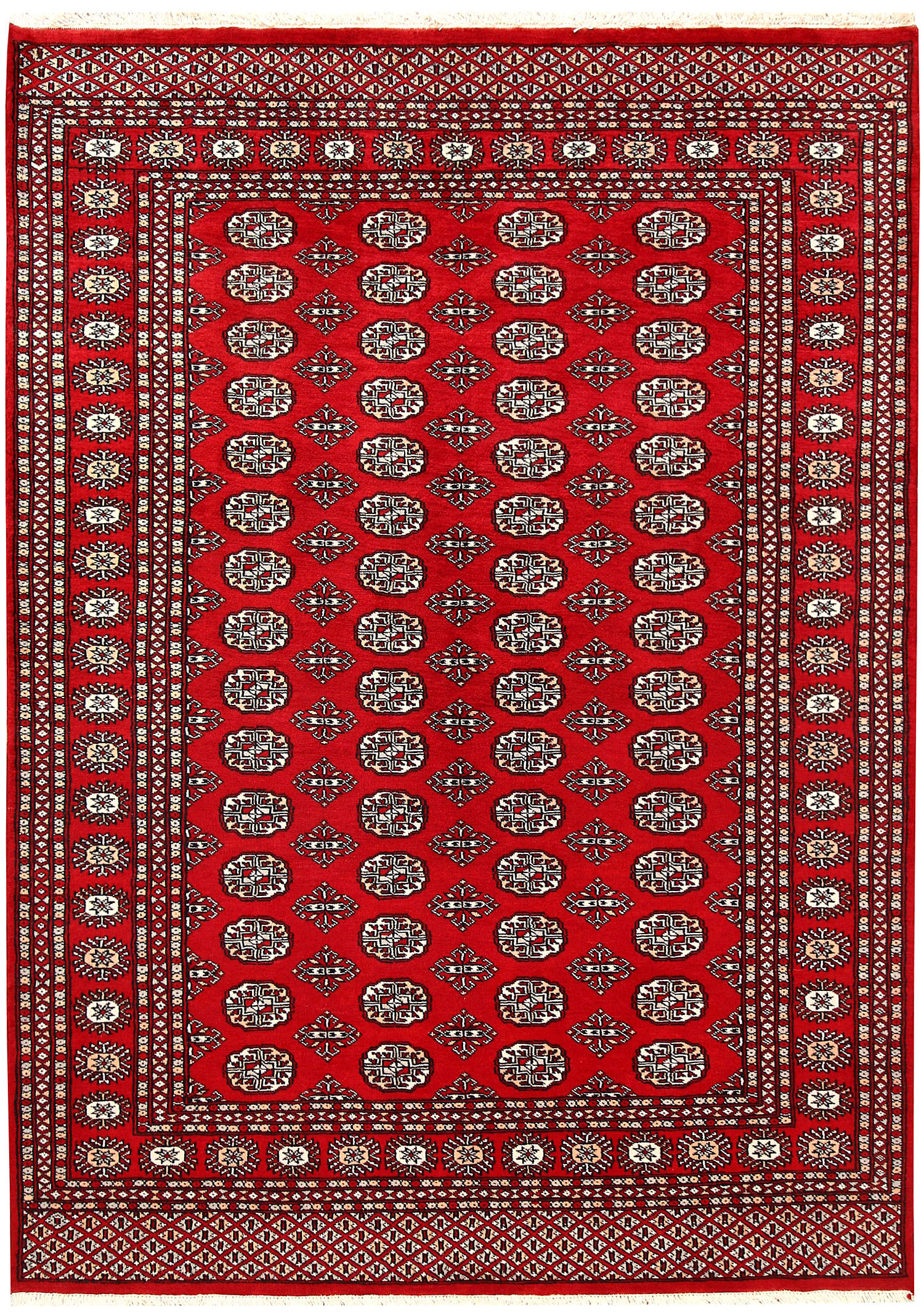 Yomud Bokharas are named after the Yomud tribe residing in Central Asia. They are known for their Caucasian features and Persian or Turkish knots. Many have diagonal rows in which a single diamond-or lozenge-shaped motif is repeated with various colors. The larger Yomut carpets are made entirely of wool or goat hair, generally in symmetrical knotting; in small pieces, for which asymmetrical knotting is used more frequently. 5' x 7' area rugs are the most popular among home owners.