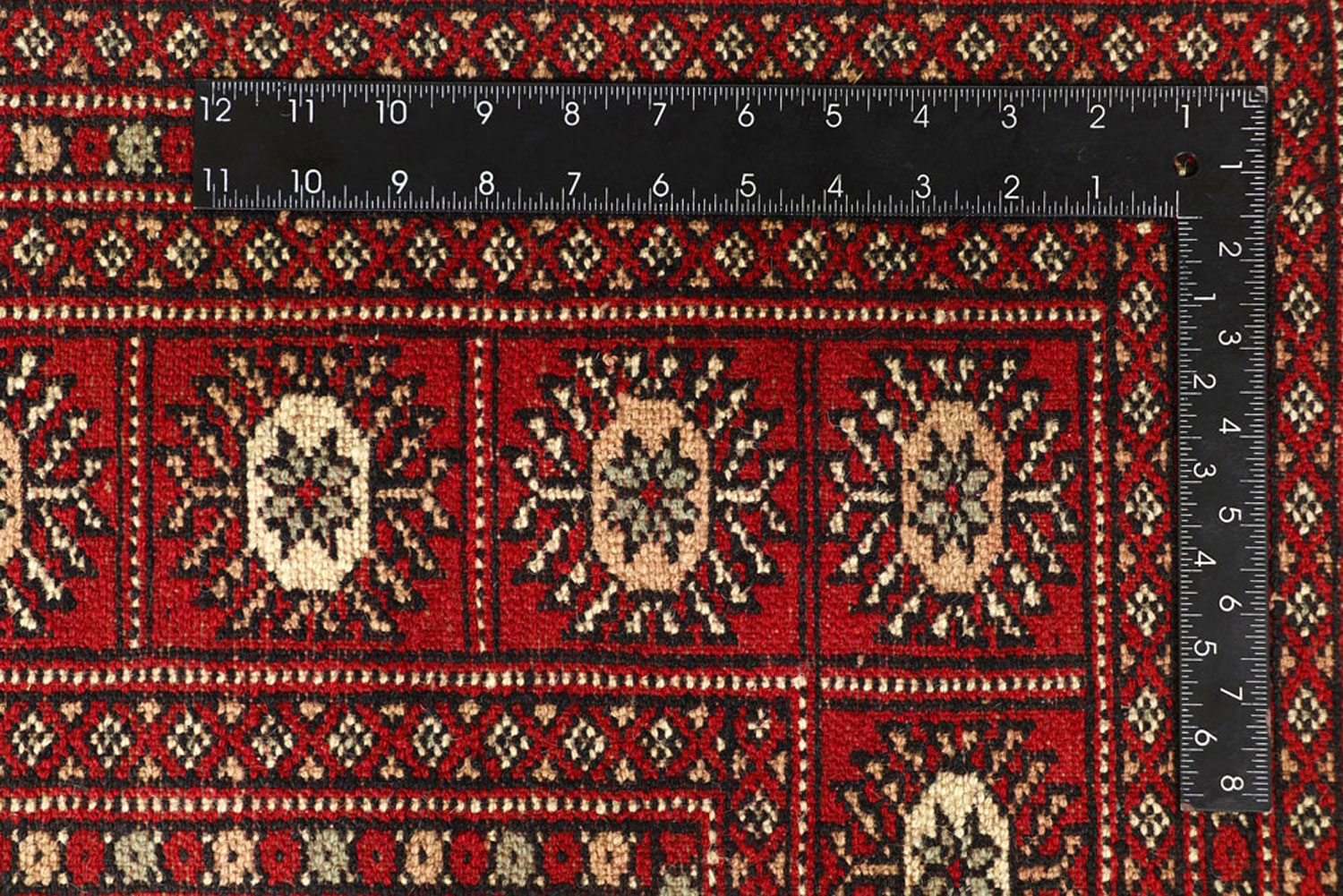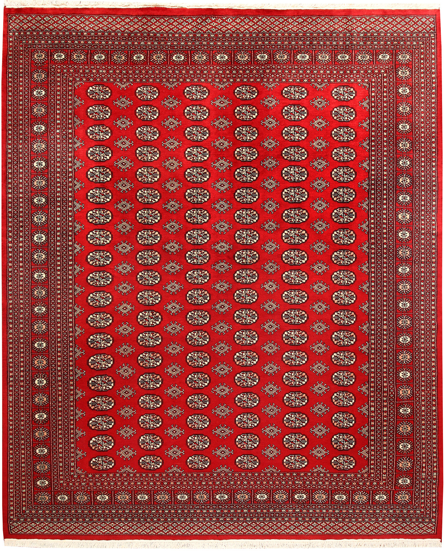 Yomud Bokharas are named after the Yomud tribe residing in Central Asia. They are known for their Caucasian features and Persian or Turkish knots. Many have diagonal rows in which a single diamond-or lozenge-shaped motif is repeated with various colors. The larger Yomut carpets are made entirely of wool or goat hair, generally in symmetrical knotting; in small pieces, for which asymmetrical knotting is used more frequently. 8' x 9' 6" area rugs are the most popular among home owners.