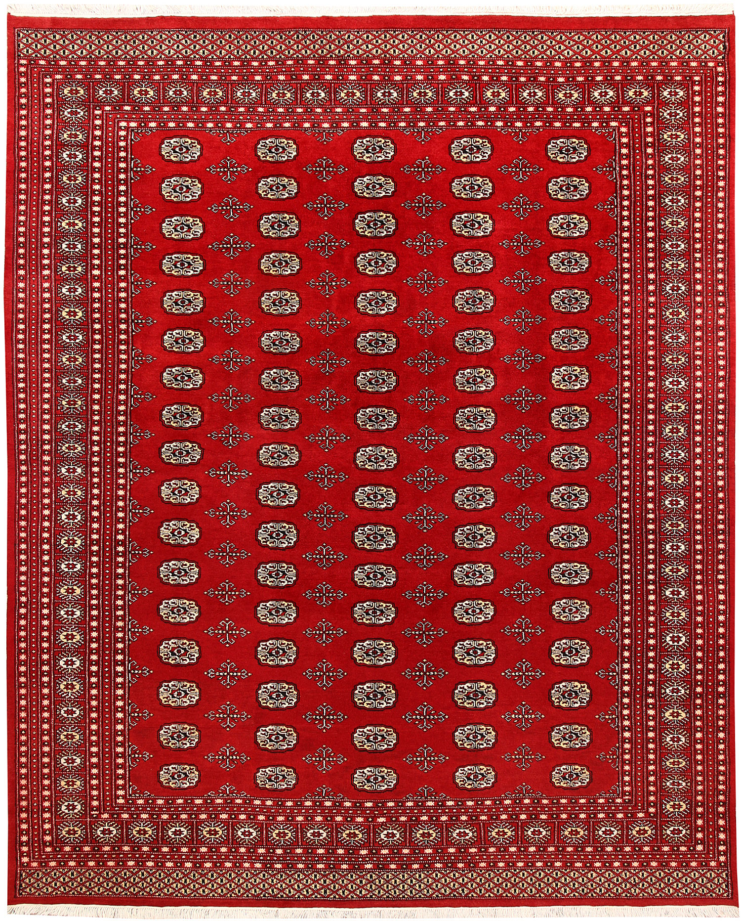 Yomud Bokharas are named after the Yomud tribe residing in Central Asia. They are known for their Caucasian features and Persian or Turkish knots. Many have diagonal rows in which a single diamond-or lozenge-shaped motif is repeated with various colors. The larger Yomut carpets are made entirely of wool or goat hair, generally in symmetrical knotting; in small pieces, for which asymmetrical knotting is used more frequently. 8' x 9' 6" area rugs are the most popular among home owners.