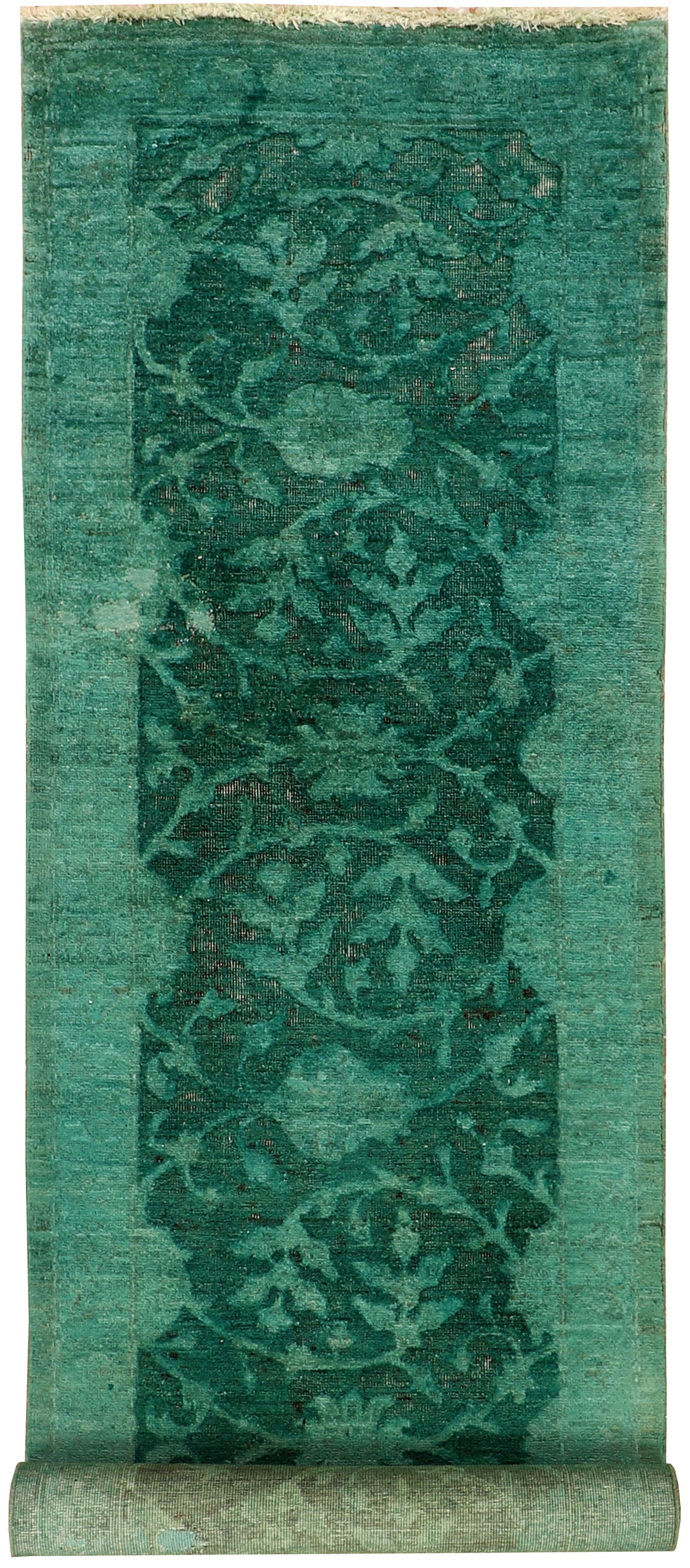 Handmade Medium Sea Green Overdyed 2' 6" x 8' 6" Runner rugs give off a vintage vibe, while emanating an aura of sophistication and elegance at the same time. Generally, Turkish carpets of at least 40-50 years of age are chosen for the process.
