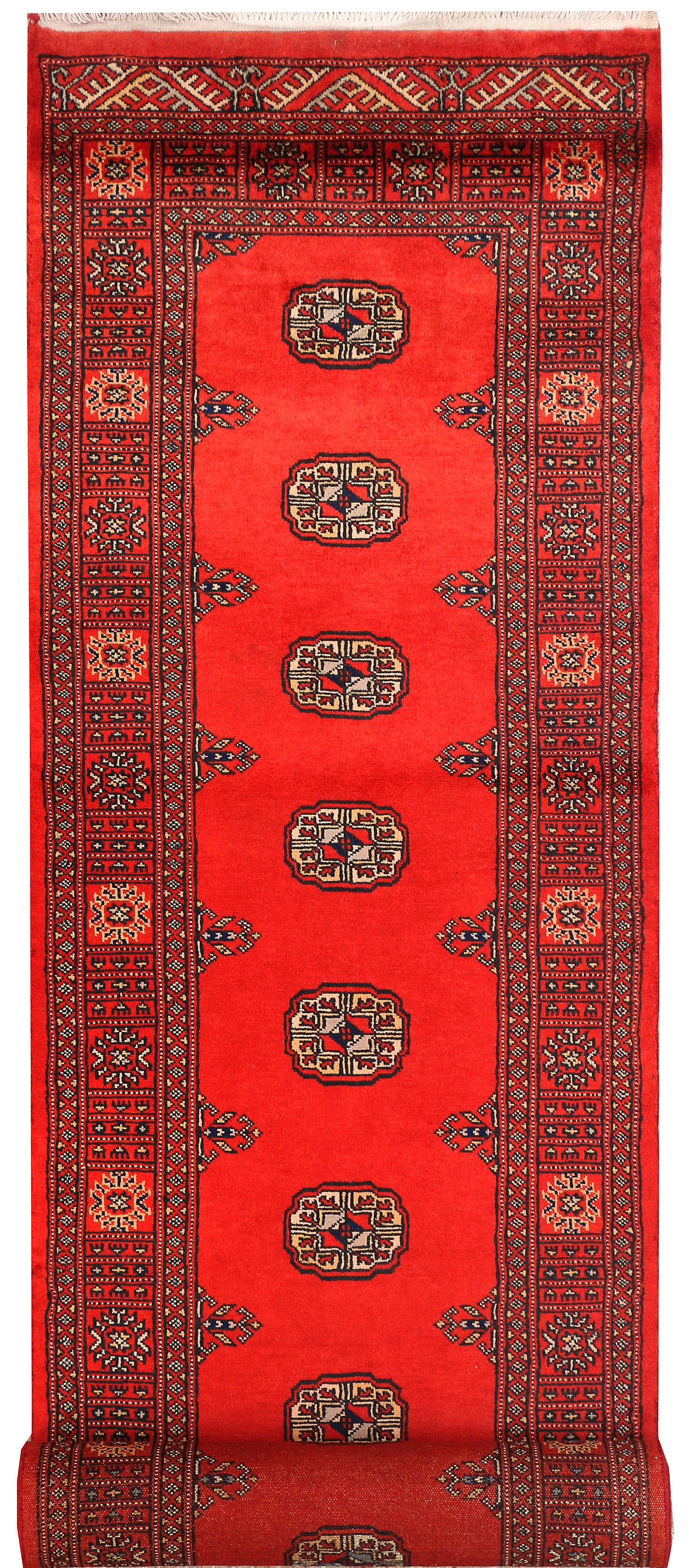 Filled with symbolic patterns and ancient designs, handmade Red Bokhara 2' 6" x 12' Runner rugs can direct attention towards themselves like nothing else!