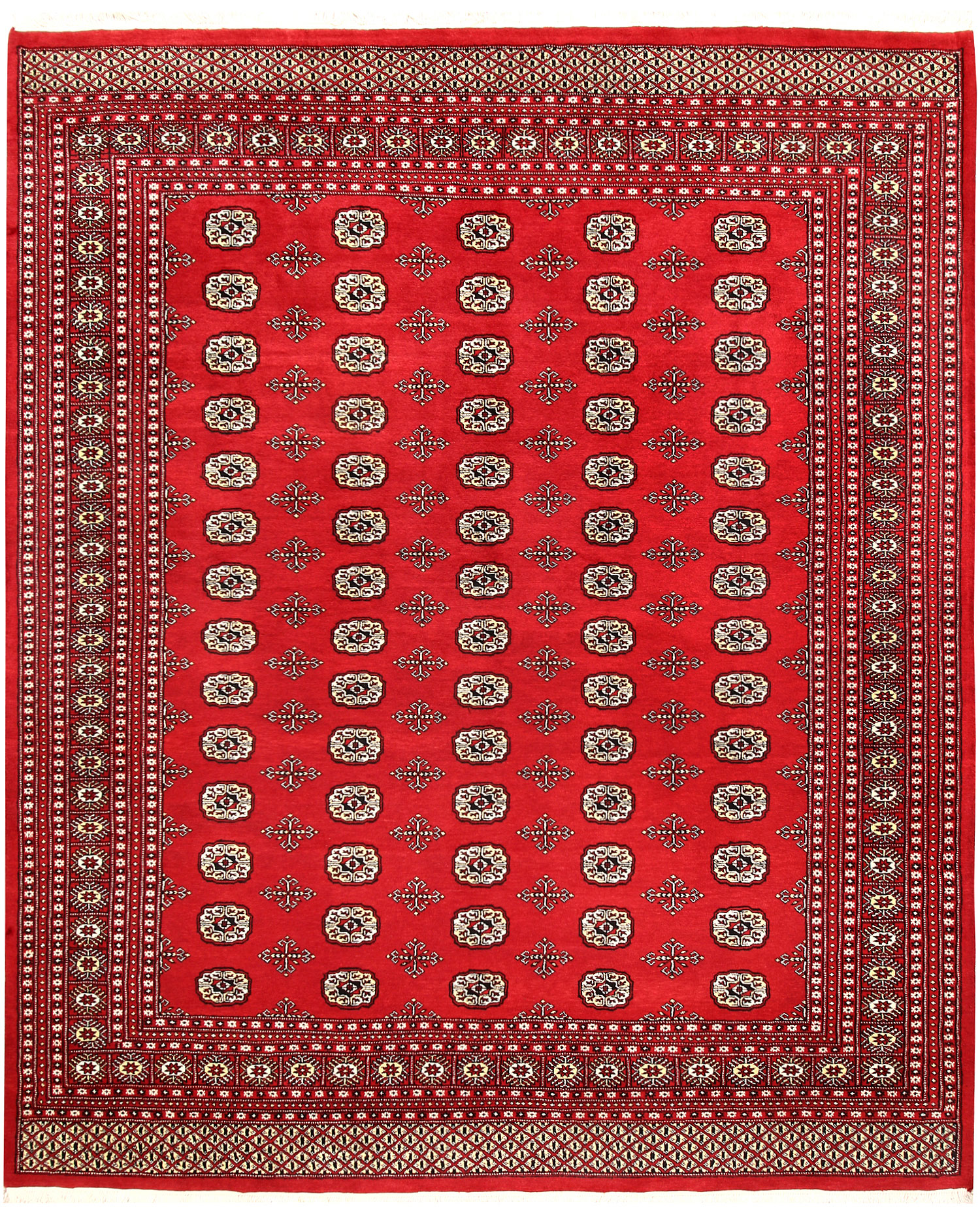 Yomud Bokharas are named after the Yomud tribe residing in Central Asia. They are known for their Caucasian features and Persian or Turkish knots. Many have diagonal rows in which a single diamond-or lozenge-shaped motif is repeated with various colors. The larger Yomut carpets are made entirely of wool or goat hair, generally in symmetrical knotting; in small pieces, for which asymmetrical knotting is used more frequently. 8' x 9' 6" area rugs are the most popular among home owners.